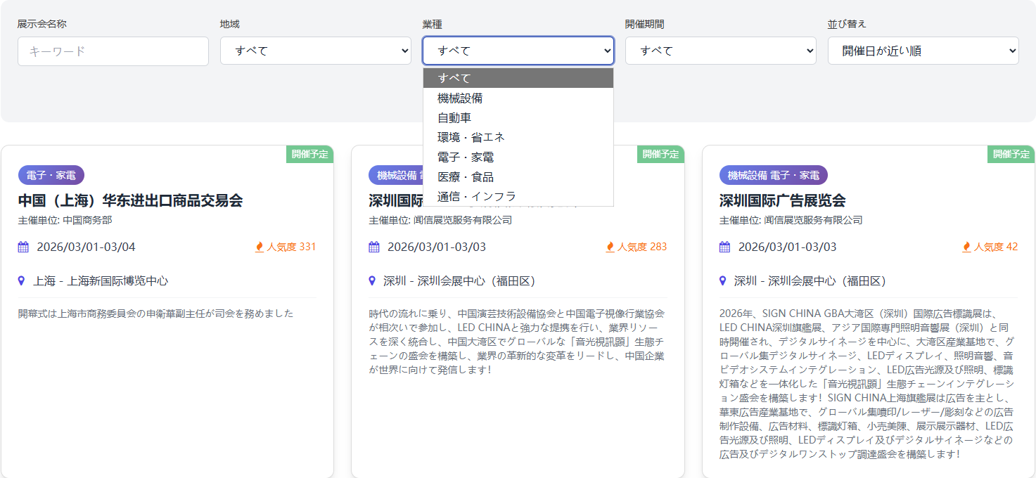 年間500件以上の展示会情報と12万社超の企業情報を継続的に更新。業界動向、製品情報、企業プロフィールをデータベース化し、北京、上海、広東、西安、重慶など中国主要の製造業展示会における出展企業情報を網羅しています。