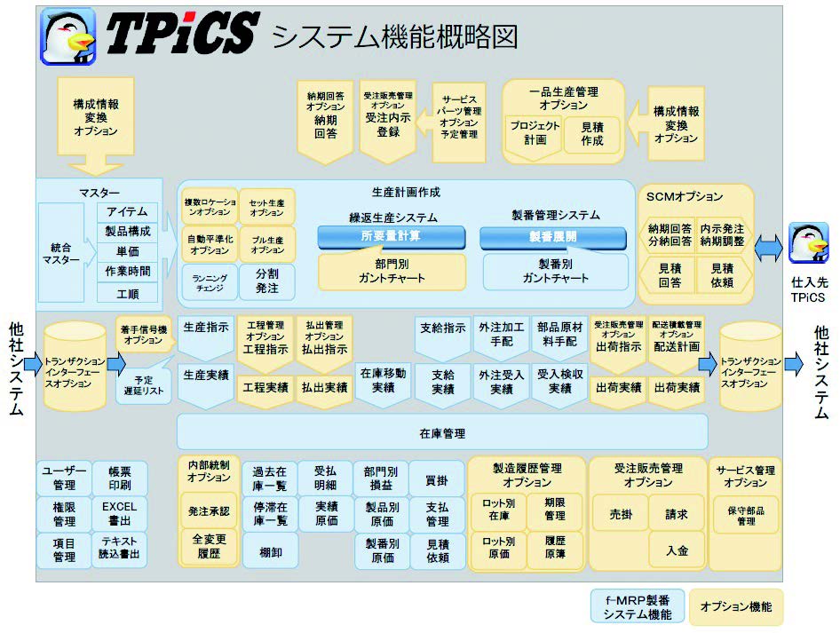 生产管理系统TPiCS-X具备可对应重复性生产、个别订货生产(一种产品或定制生产)等各种生产形态的功能。通过TPiCS自主开发的f-MRP功能,实现“速度快、成本低、反应好且稳定的生产”。从产品的销售计划和生产计划出发,根据产品构成表、生产周期、批量大小等,自动制作完成到中间单元、末端原材料为止的生产和流程计划。